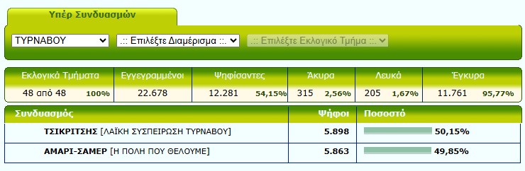 Για να δείτε αναλυτικά το εκλογικό αποτέλεσμα σε όλα τα διαμερίσματα του δήμου Τυρνάβου πατήστε ΕΔΩ