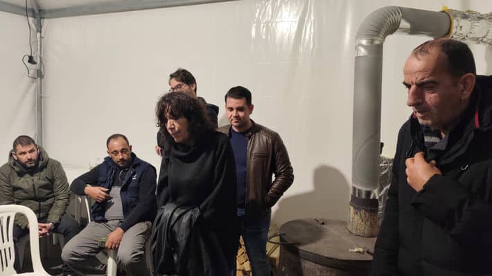 Στο άλλο κατάλυμα, των χωριών του Τυρνάβου, οι αγρότες υποδέχονται αντιπροσωπεία του Συλλόγου Γιατρών με επικεφαλής την πρόεδρό του, Γεωργία Παπαδάμου, και του Σωματείου Εργαζομένων του Πανεπιστημιακού Νοσοκομείου Λάρισας, που βρίσκεται εκεί αποβραδίς στο μπλόκο για να εκφράσει συμπαράσταση και αλληλεγγύη στους αγωνιζόμενους αγρότες.