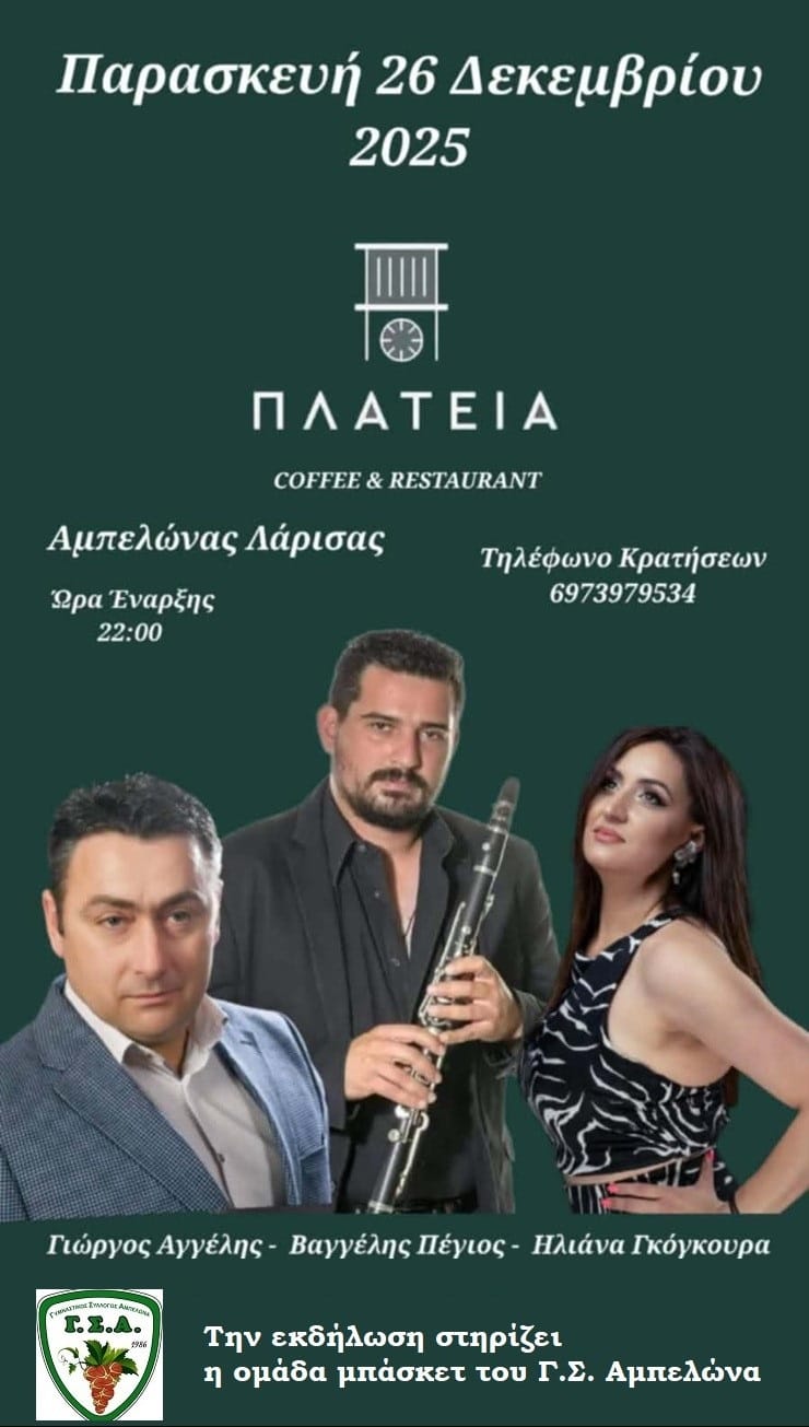 Μία υπέροχη μουσική βραδιά ανάλογη με το εορταστικό κλίμα των ημερών διοργανώνει την Παρασκευή 26 Δεκεμβρίου, 2η ημέρα των Χριστουγέννων, το καφέ μπαρ Πλατεία στο κέντρο του Αμπελώνα με τον Βαγγέλη Πέγιου στο κλαρίνο, τον Γιώργο Αγγέλη και την Ηλιάνα Γκόγκουρα στο τραγούδι και με την ορχήστρα τους.