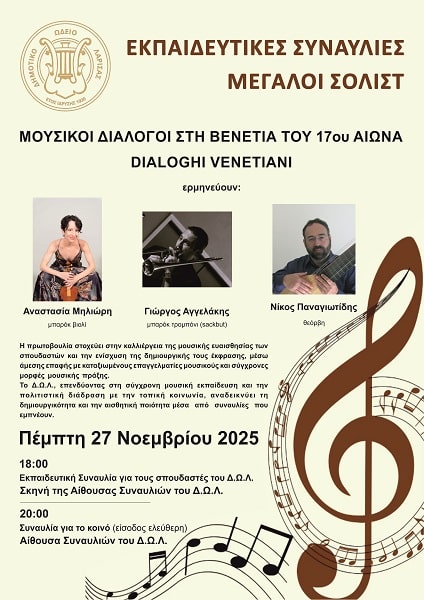 Το μουσικό πρόγραμμα «Dialoghi Veneziani» φέρνει στο Δημοτικό Ωδείο Λάρισας έναν κόσμο γεμάτο χρώμα, φαντασία και ήχους μιας εποχής όπου η μουσική εξελισσόταν με ασυνήθιστη τόλμη. Με όργανα εποχής και ρεπερτόριο από τις αρχές του 17ου αιώνα, οι καλλιτέχνες ξεδιπλώνουν έναν ηχητικό καμβά που γεννήθηκε στη Βενετία, μια πόλη που υπήρξε πυρήνας δημιουργικότητας και καινοτομίας στην πρώιμη μπαρόκ περίοδο. Στη συναυλία συμμετέχουν οι Αναστασία Μηλιώρη στο μπαρόκ βιολί, ο Γιώργος Αγγελάκης στο μπαρόκ τρομπόνι και ο Νίκος Παναγιωτίδης στη θεόρβη.
