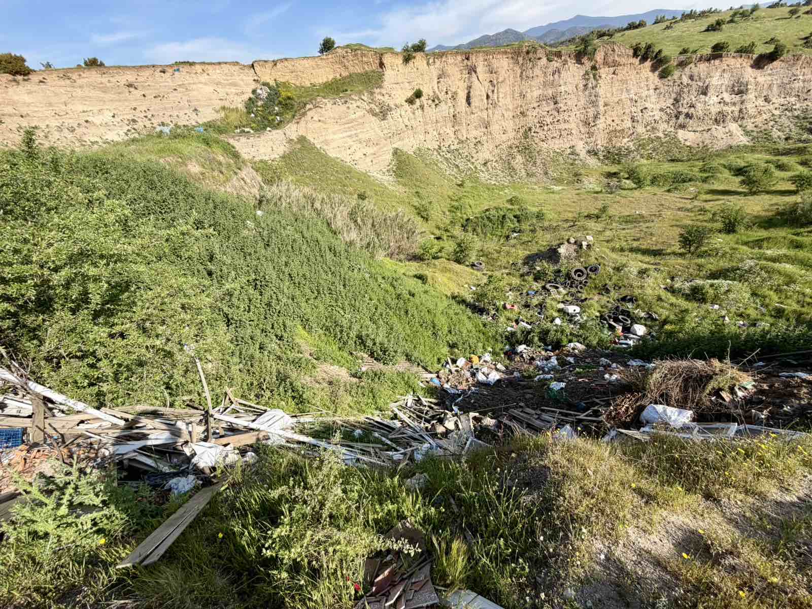 Μπάζα και ξύλα οικοδομής, παλιά έπιπλα, σκουπίδια, λάστιχα οχημάτων κ.α. συνθέτουν ένα απαραδεκτο τοπίο και μάλιστα σε δύσβατο σημείο που είναι σχεδόν αδύνατο να προσεγγιστεί από οχήματα καθαρισμού του χώρου.
