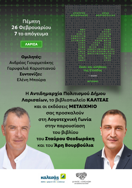 Το νέο τους βιβλίο με τίτλο “14 σκιές και αλήθειες της Ελλάδας|”, παρουσιάζουν ο δημοσιογράφος Σταύρος Θεοδωράκης και ο Άρης Βουρβούλιας, την Πέμπτη 26 Φεβρουαρίου 2026, στις 19:00 στη Λογοτεχνική Γωνία (Γαληνού & Φαρμακίδου), στη Λάρισα, σε συνεργασία με την Αντιδημαρχία Πολιτισμού του Δήμου Λαρισαίων
