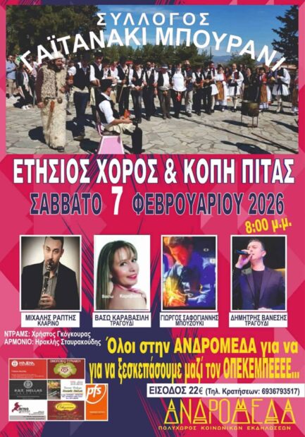 Ο σύλλογος Γαϊτανάκι – Μπουρανί διοργανώνει και περιμένει όλο τον κόσμο με χαρά στον ετήσιο χορό και στην κοπή της πίτας του συλλόγου το Σάββατο 07 Φεβρουαρίου και ώρα 20:00 στην Ανδρομέδα ”social events room” .