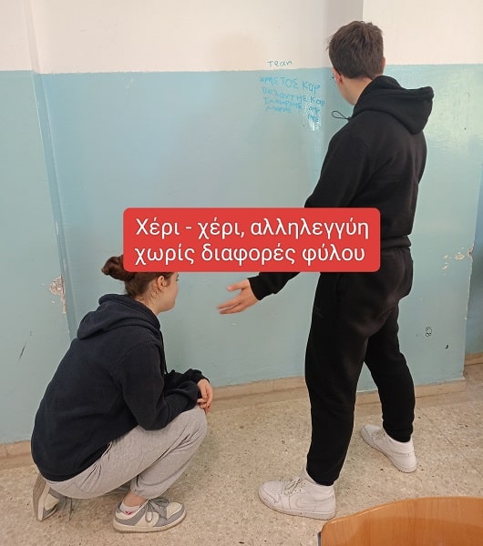 Στη δεύτερη εικόνα μια μαθήτρια είναι σκυμμένη, σε στάση που αποτυπώνει ευαλωτότητα ή ανάγκη για υποστήριξη, και ένα αγόρι τείνει το χέρι του προς εκείνη, προσφέροντας βοήθεια. Πρόκειται για μια λιτή αλλά δυνατή χειρονομία, που αναδεικνύει πως αγόρια και κορίτσια πρέπει να στέκονται το ένα δίπλα στο άλλο, χωρίς στερεότυπα, με κατανόηση και αλληλεγγύη.