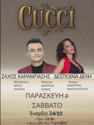 Δύο όμορφες μουσικές βραδιές υπόσχονται για την Παρασκευή και το Σάββατο 24 και 25 Οκτωβρίου οι υπεύθυνοι του καφέ CUCCI στον Τύρναβο.