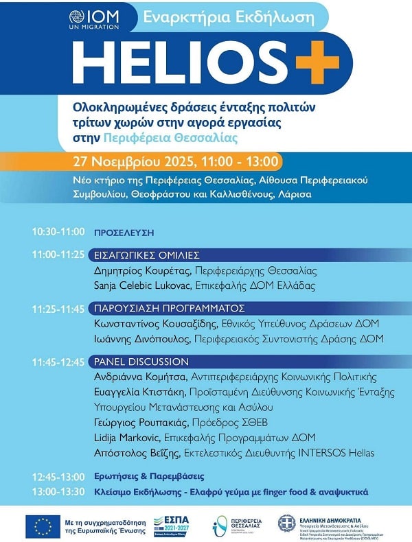 Η Περιφέρεια Θεσσαλίας και ο Διεθνής Οργανισμός Μετανάστευσης (IOM) διοργανώνουν την Εναρκτήρια Εκδήλωση του προγράμματος HELIOS+, με αντικείμενο τις Ολοκληρωμένες δράσεις ένταξης πολιτών τρίτων χωρών στην αγορά εργασίας στην Περιφέρεια Θεσσαλίας.