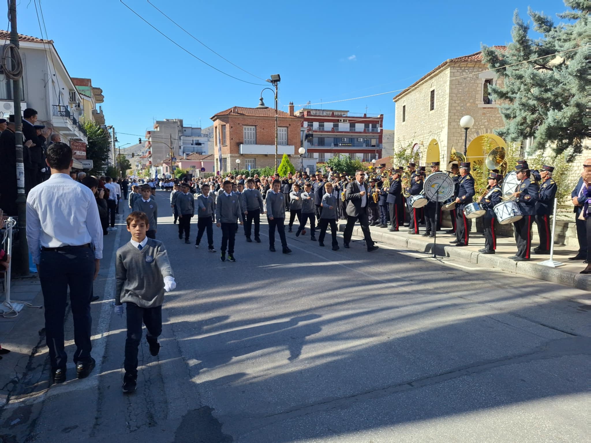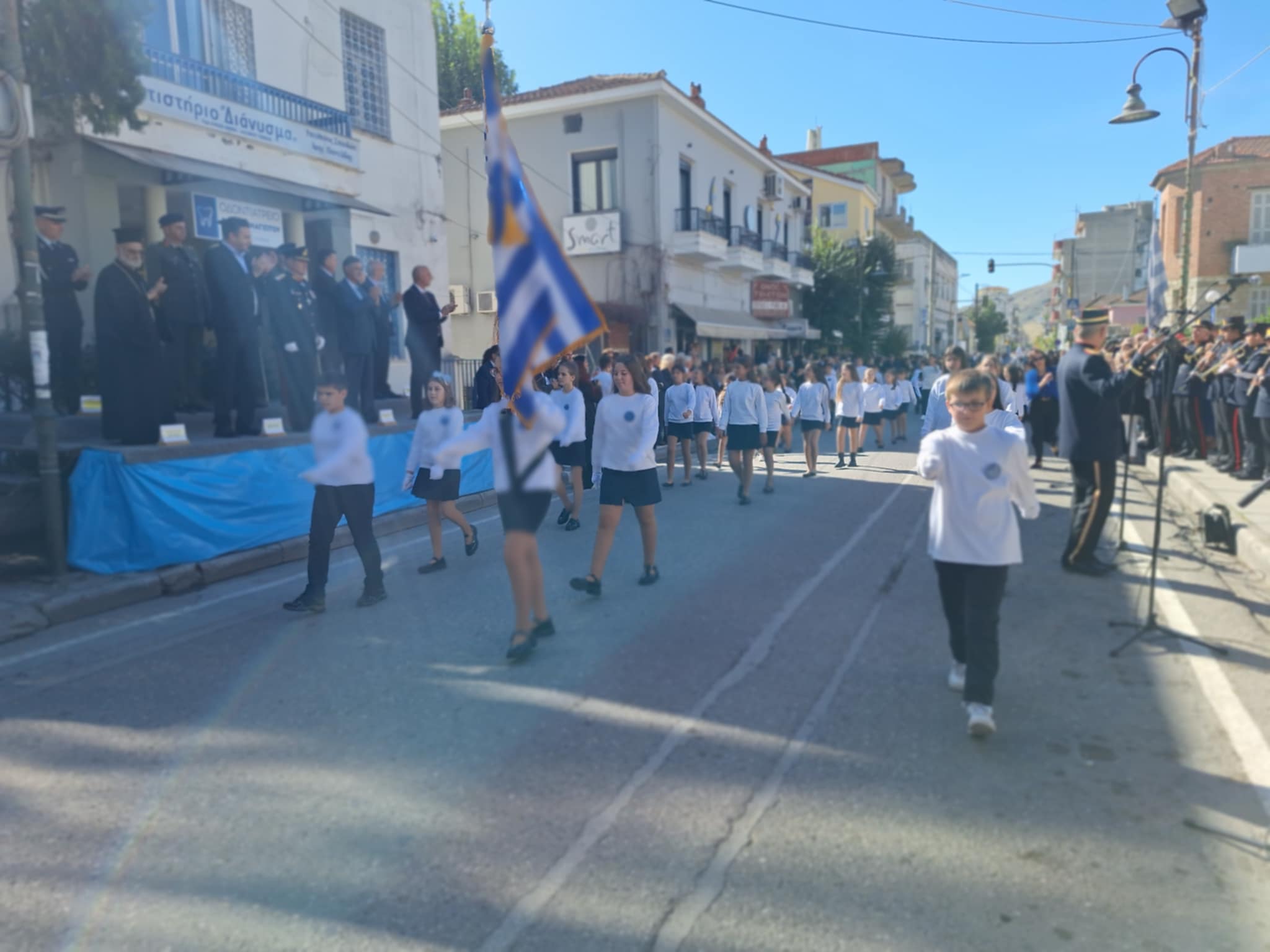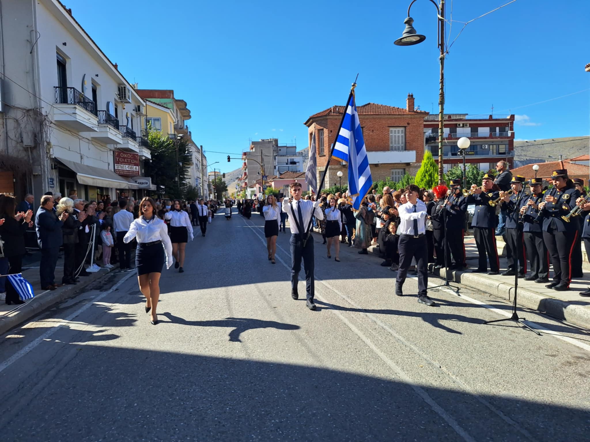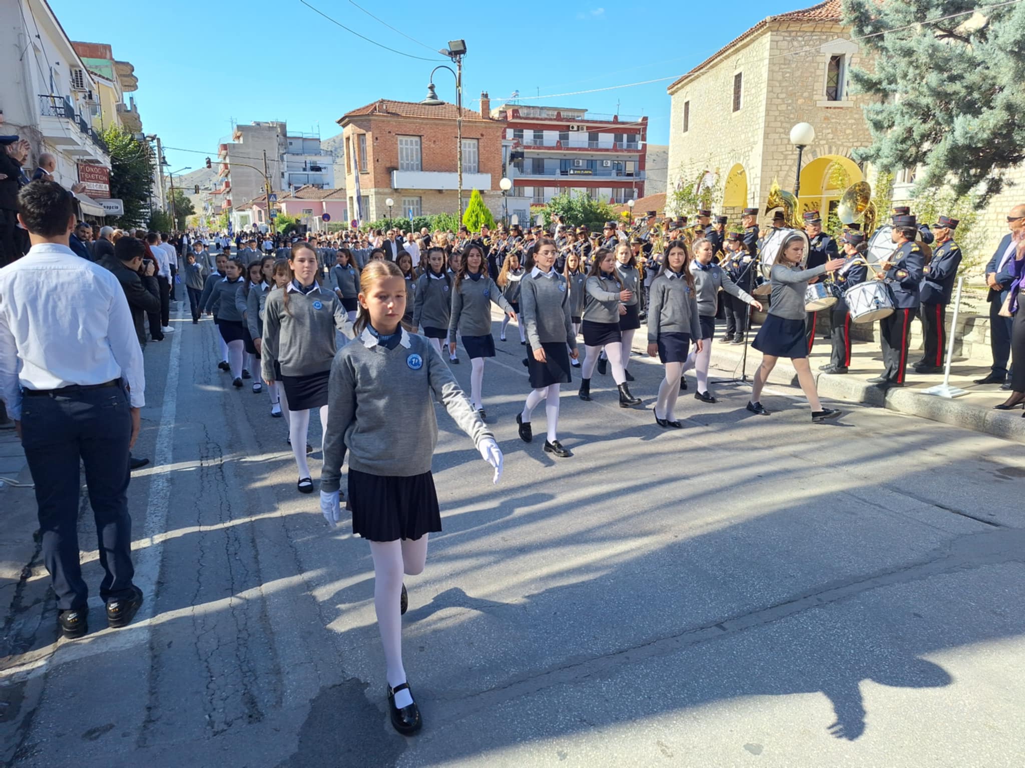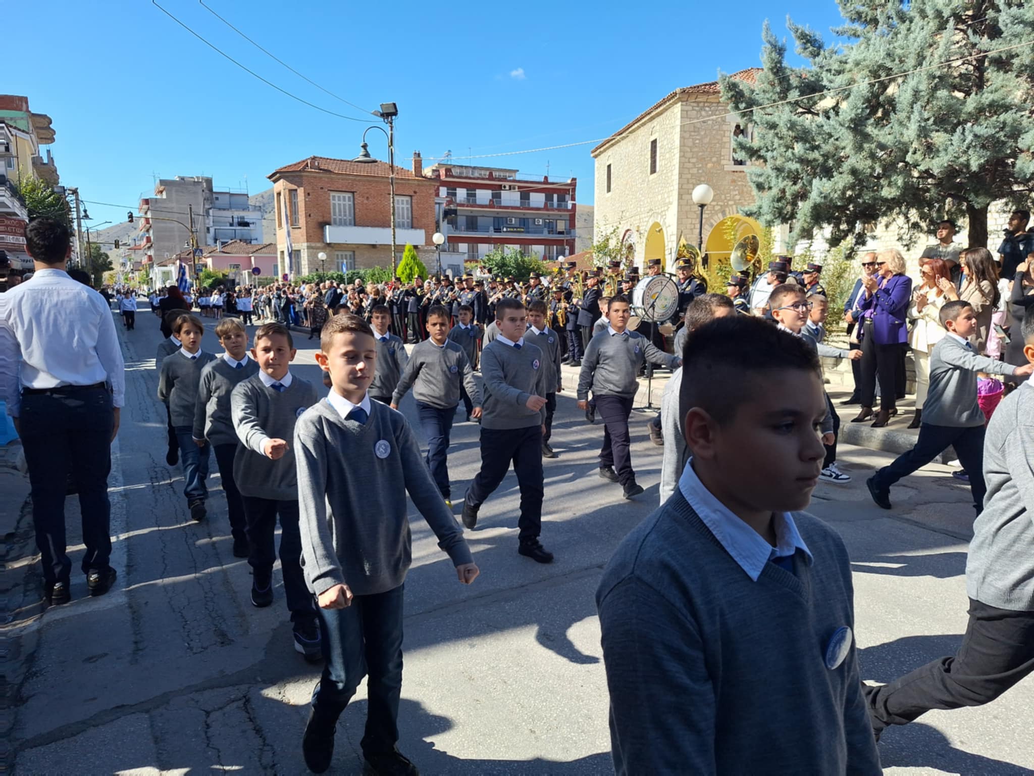 Το μέγα πλήθος του κόσμου παρακολούθησε τη μαθητική παρέλαση που έγινε με τους ήχους της φιλαρμονικής του δήμου και καταχειροκρότησε τους μαθητές.