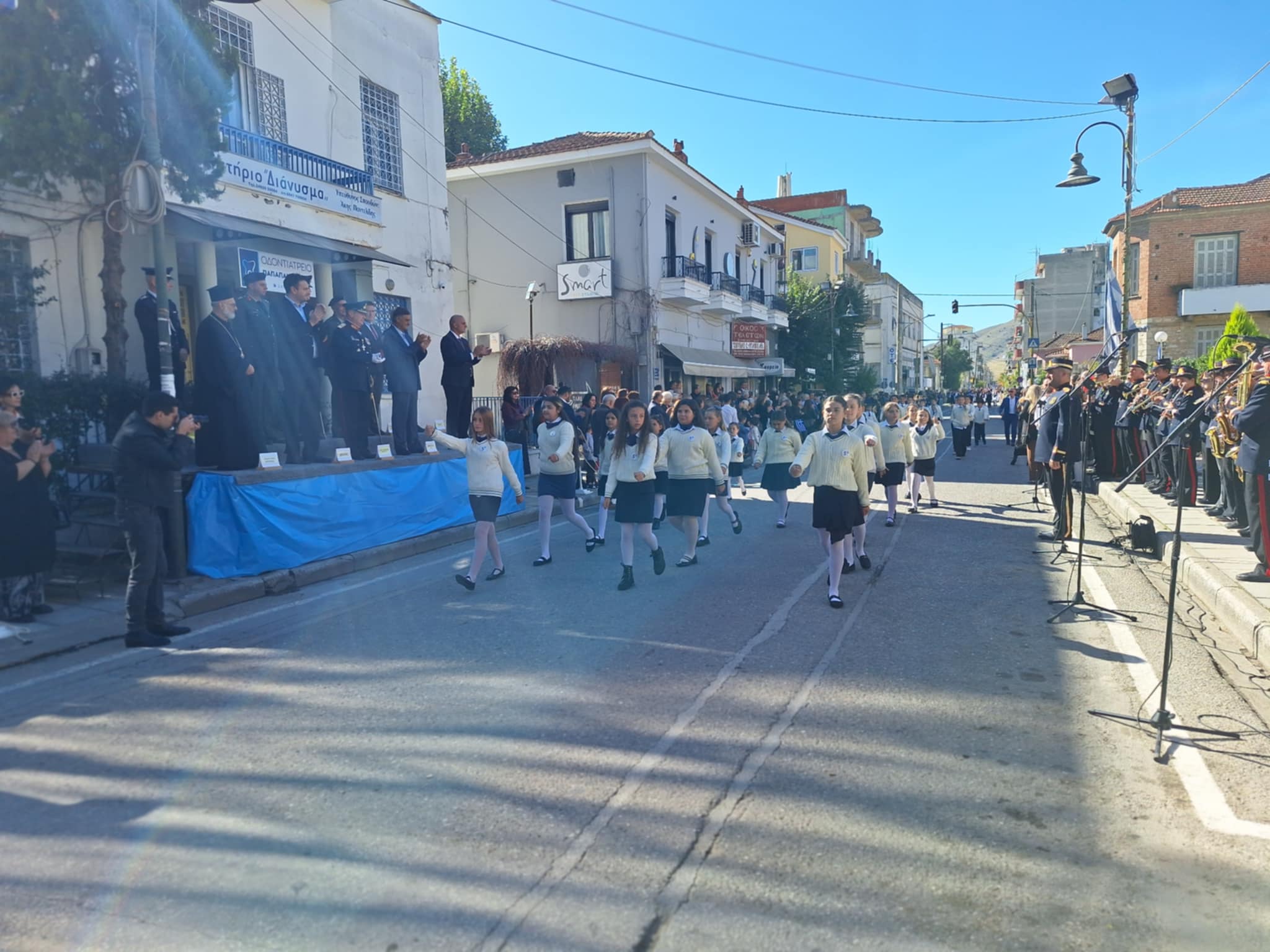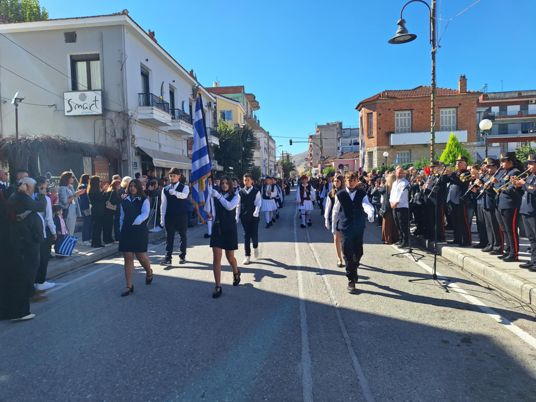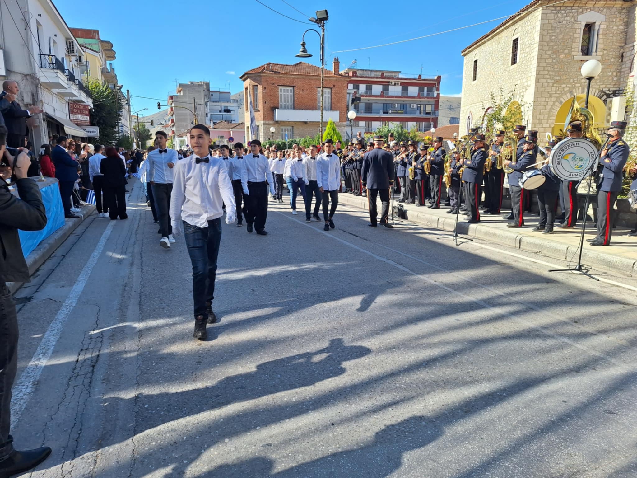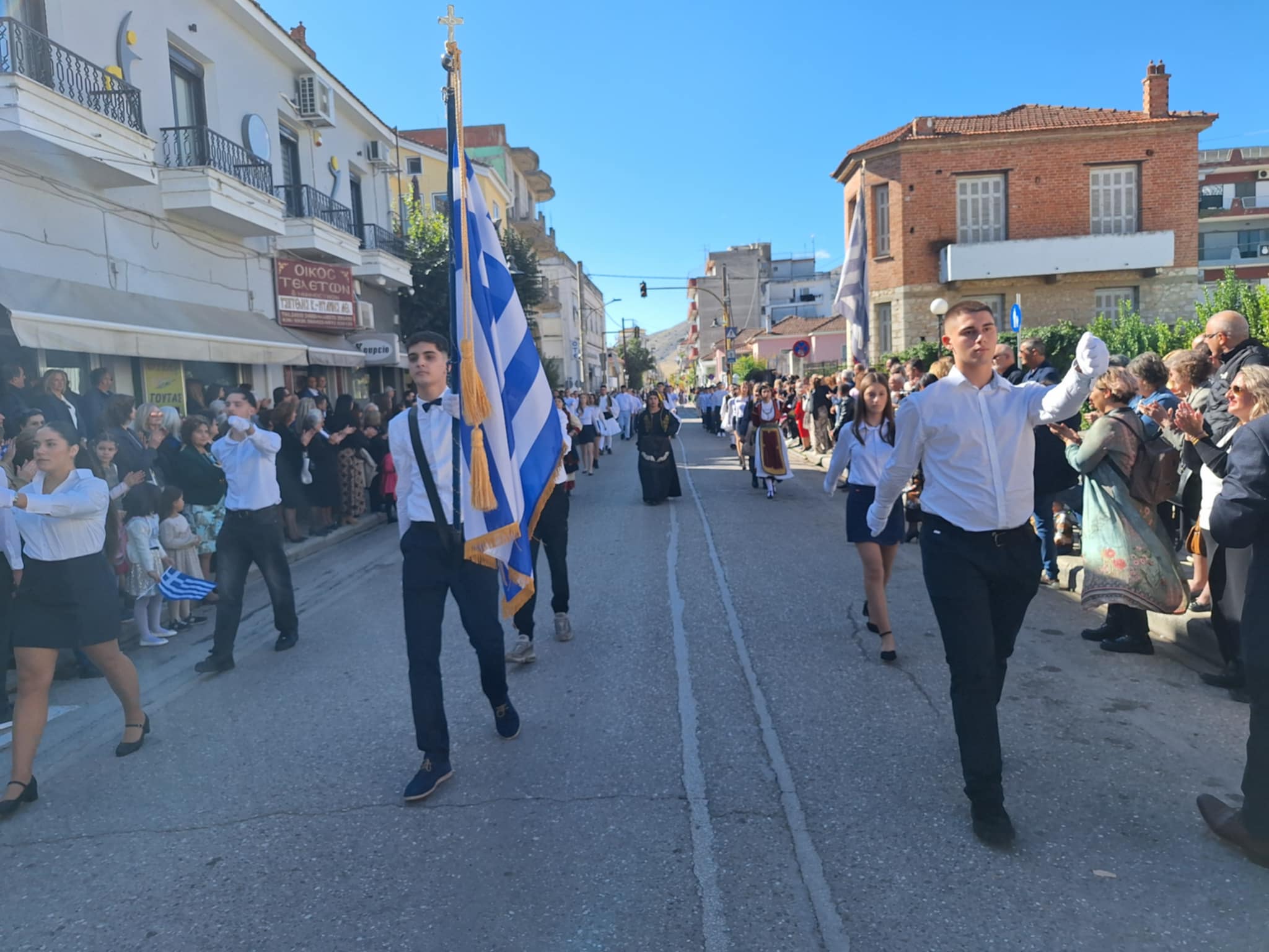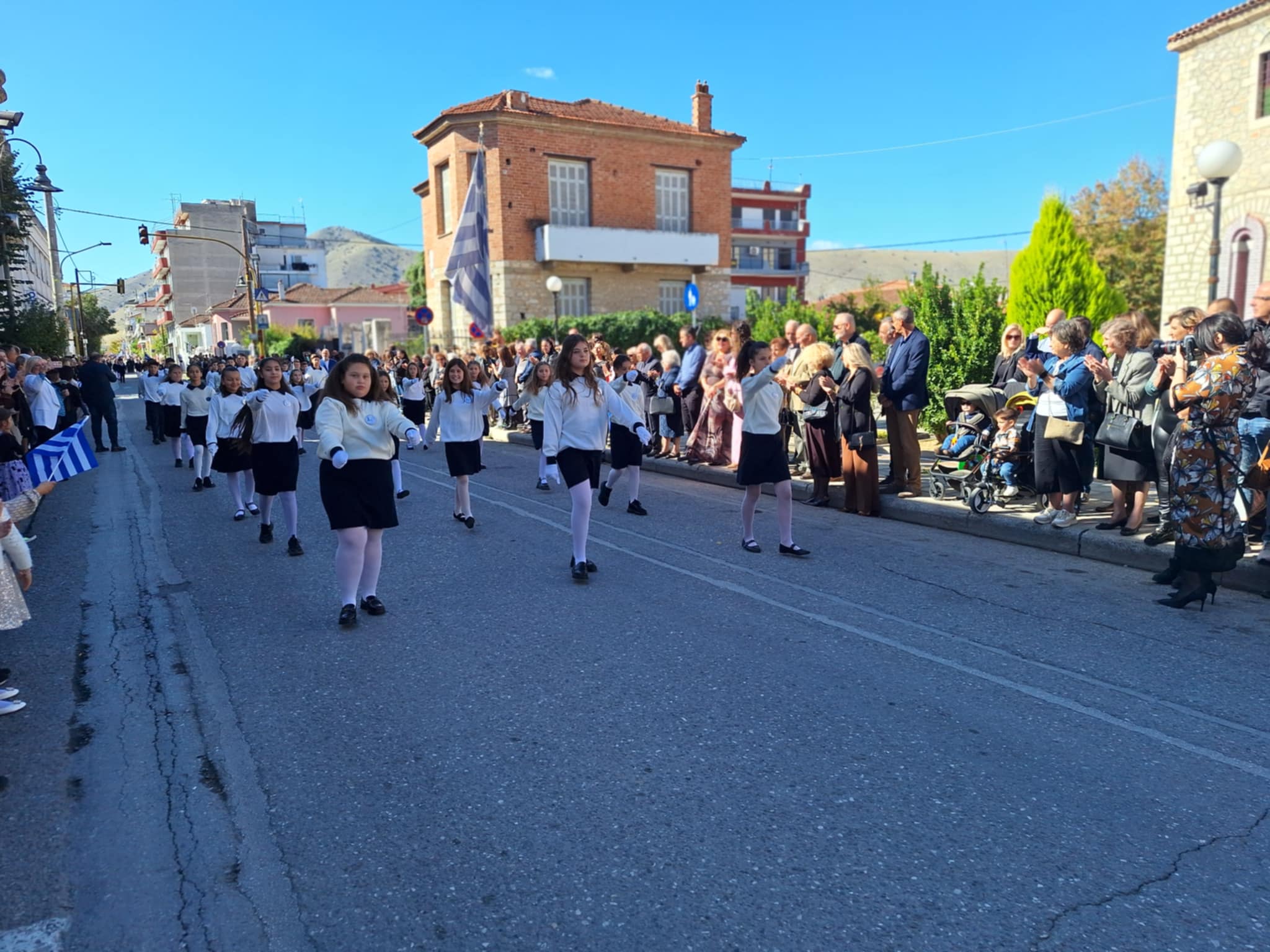 Το μέγα πλήθος του κόσμου παρακολούθησε τη μαθητική παρέλαση που έγινε με τους ήχους της φιλαρμονικής του δήμου και καταχειροκρότησε τους μαθητές.