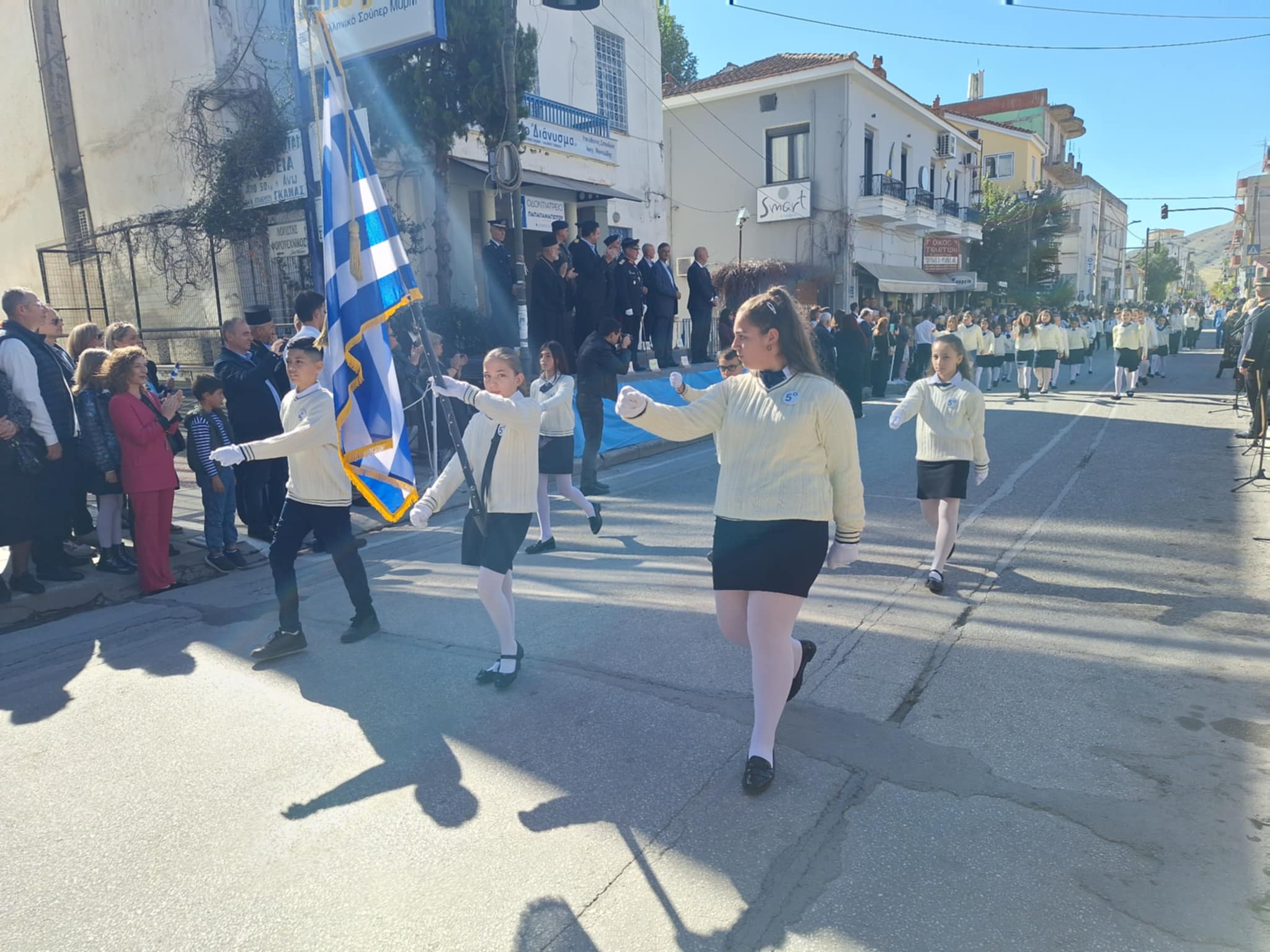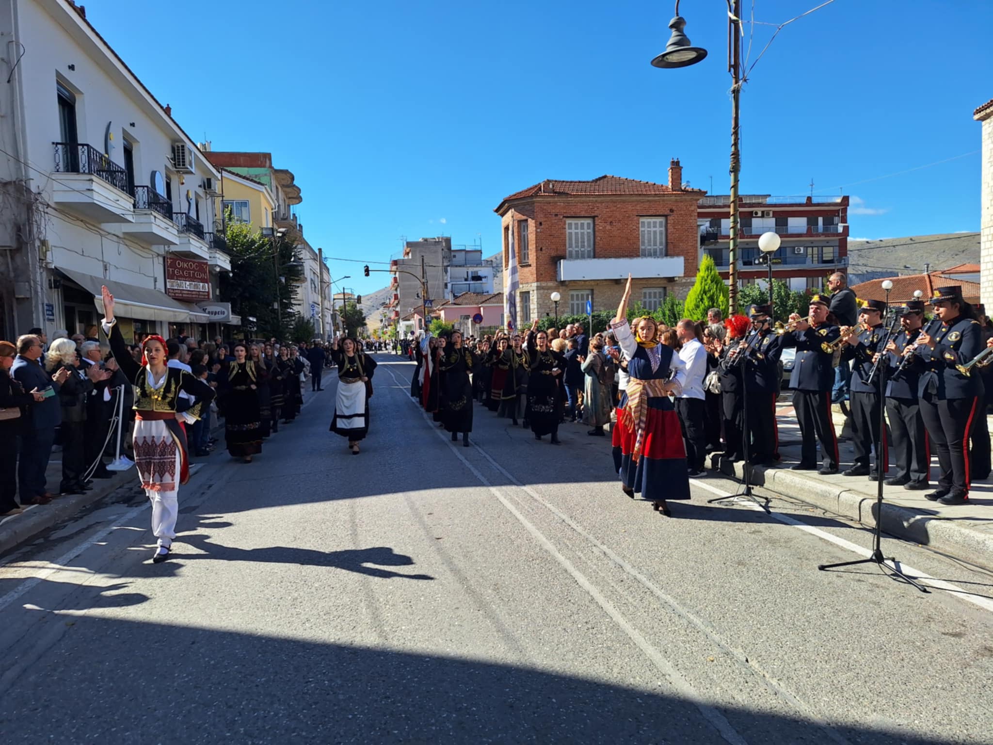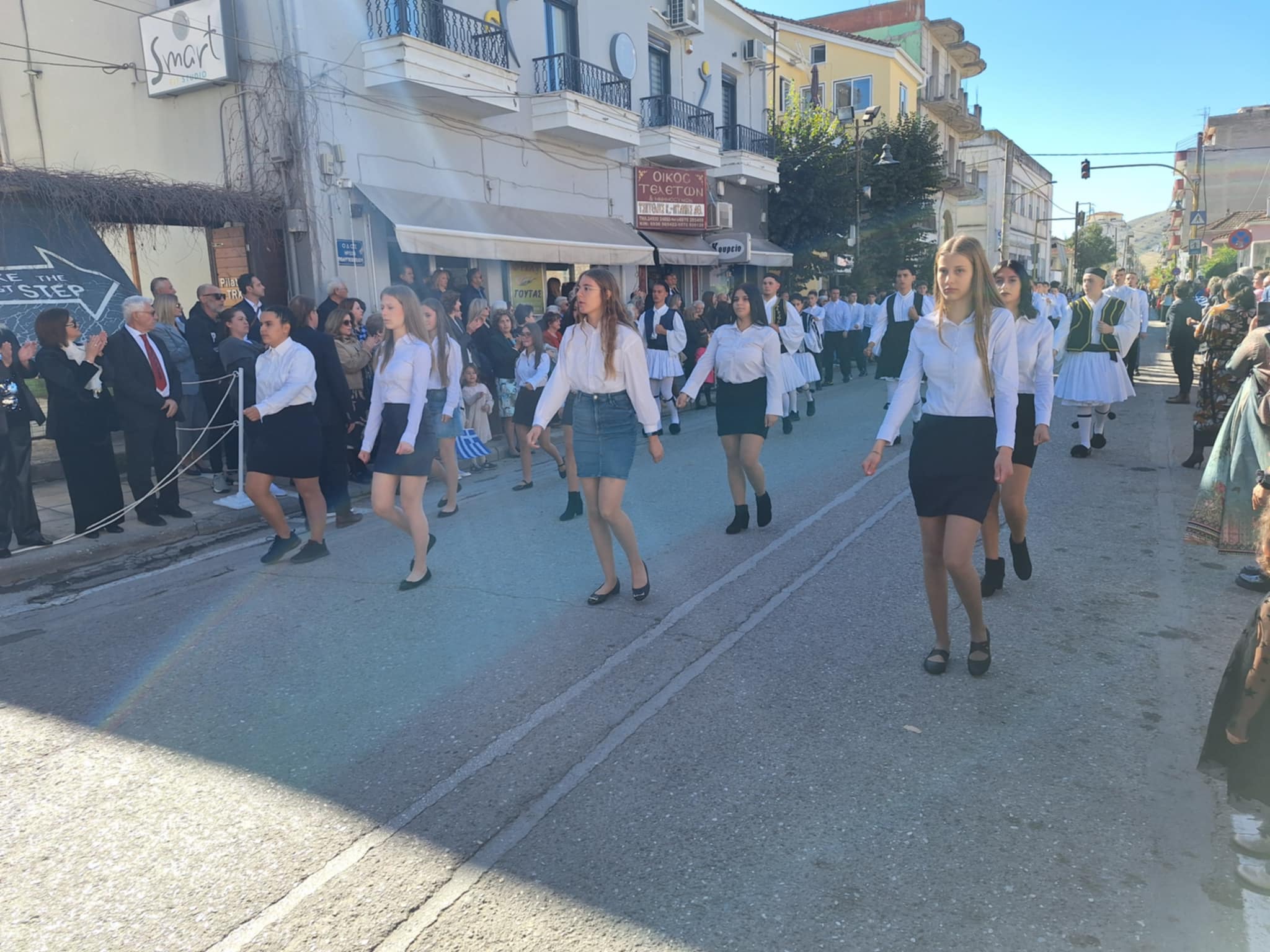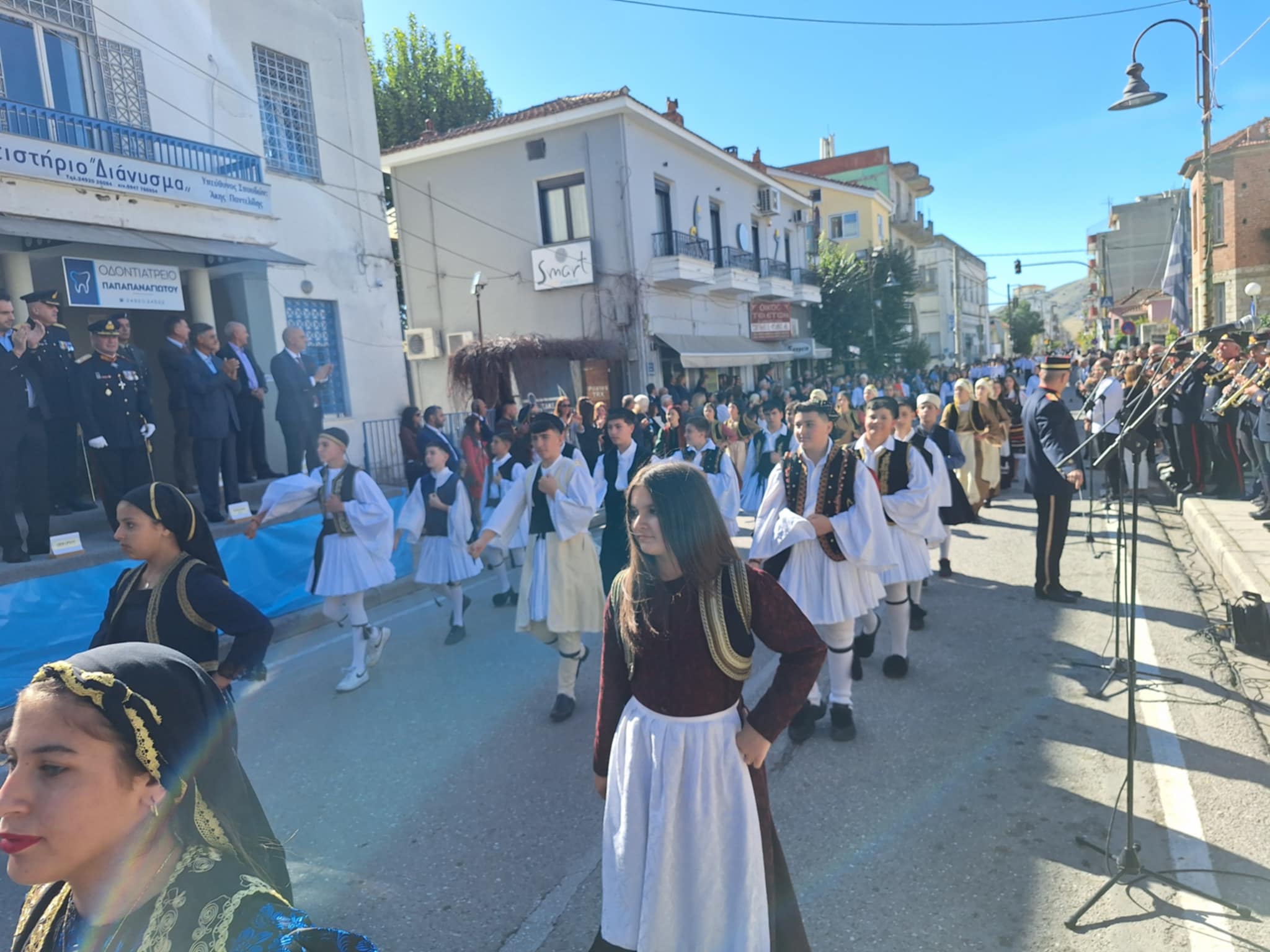 Το μέγα πλήθος του κόσμου παρακολούθησε τη μαθητική παρέλαση που έγινε με τους ήχους της φιλαρμονικής του δήμου και καταχειροκρότησε τους μαθητές.