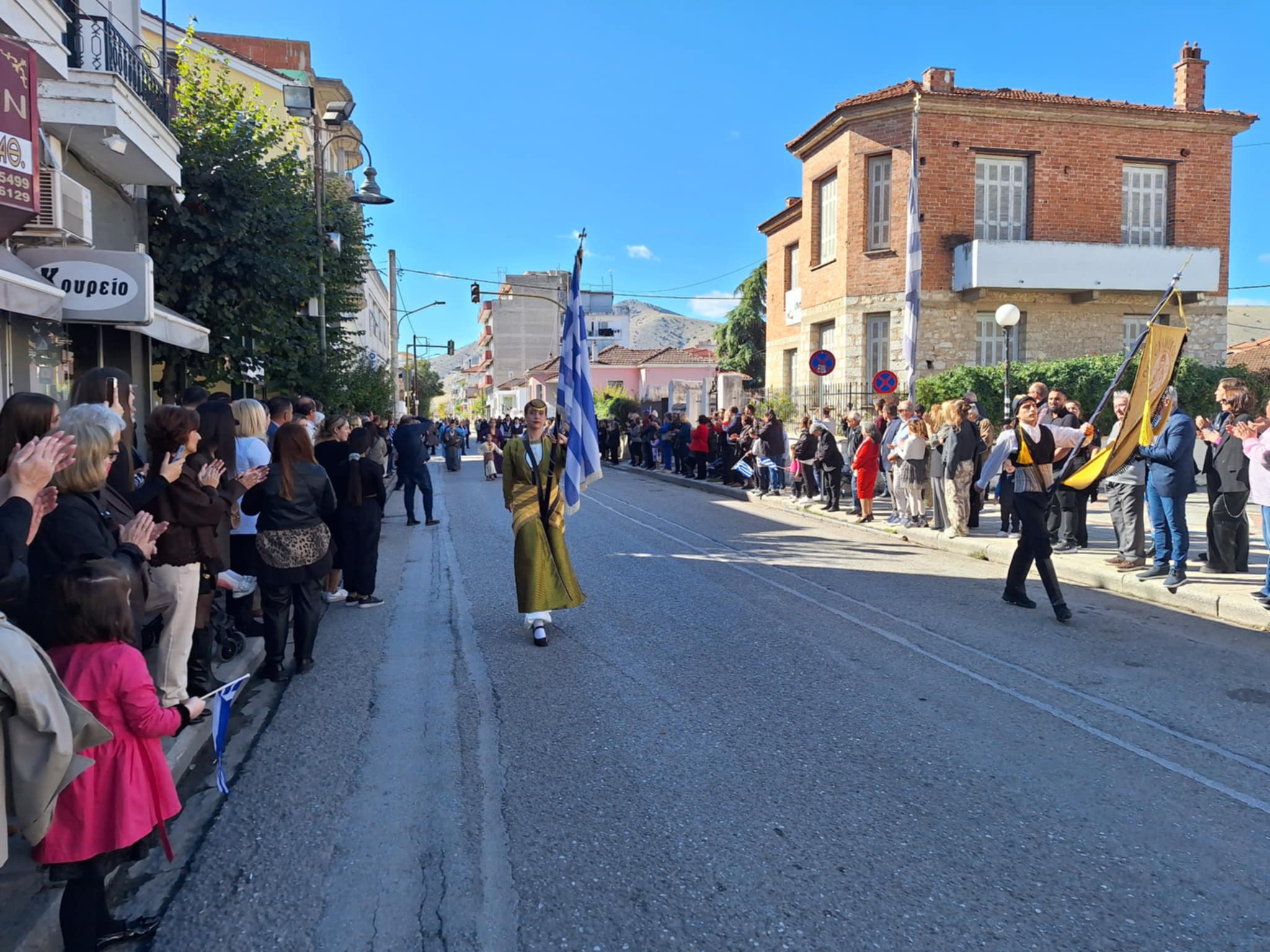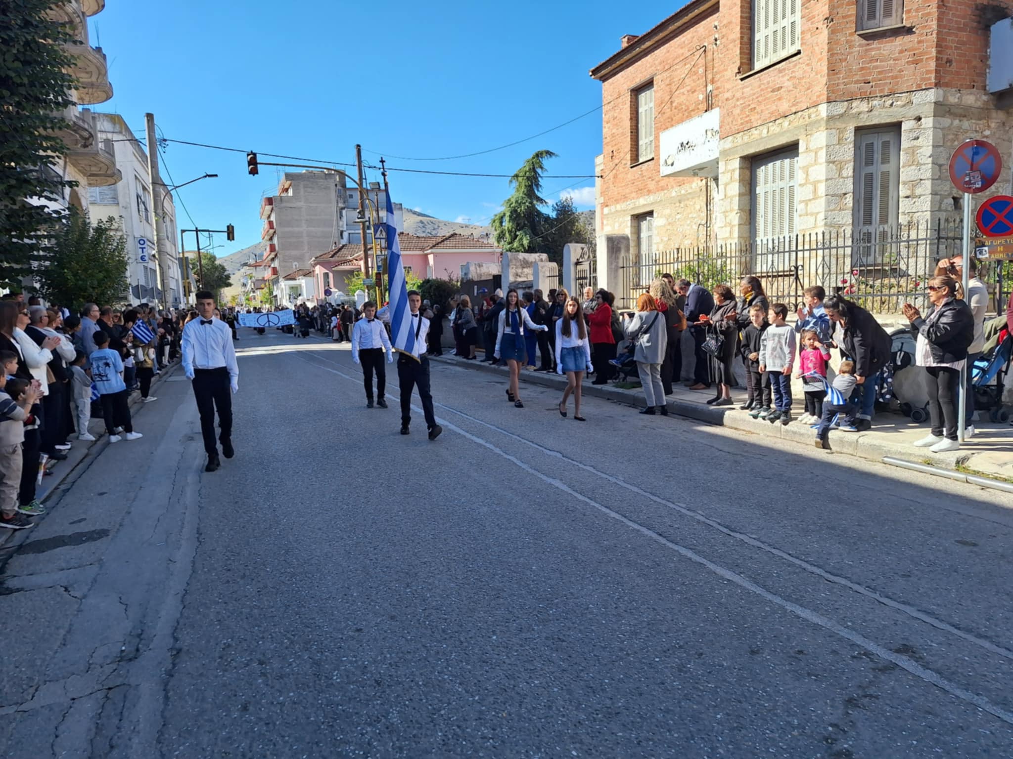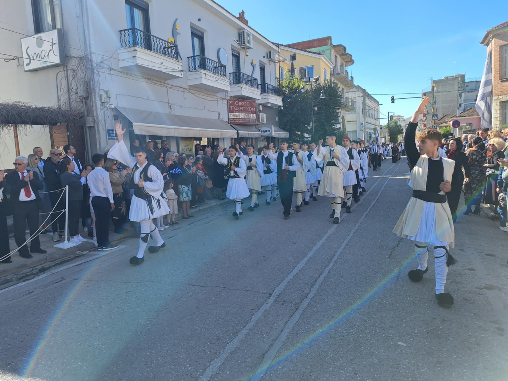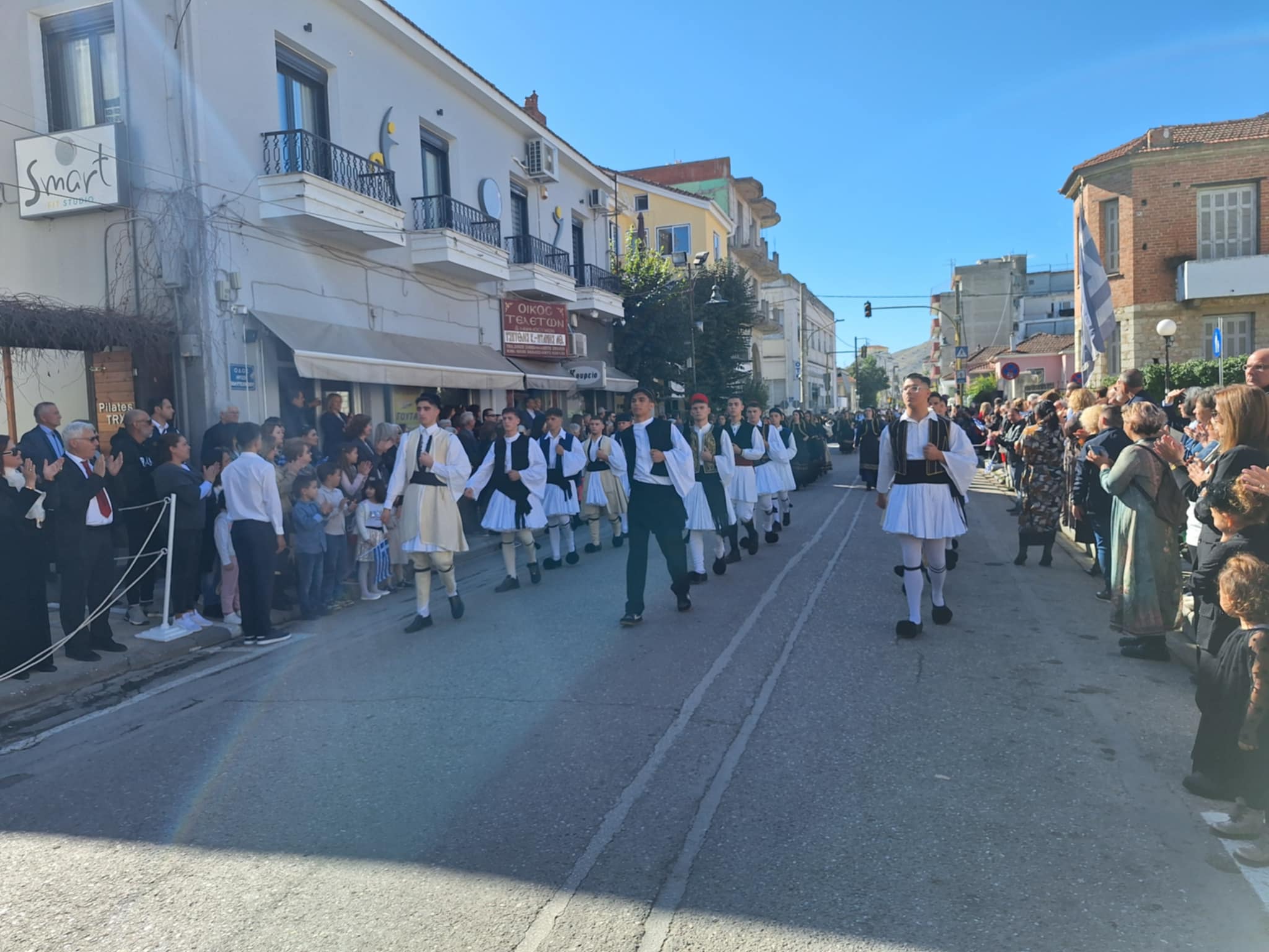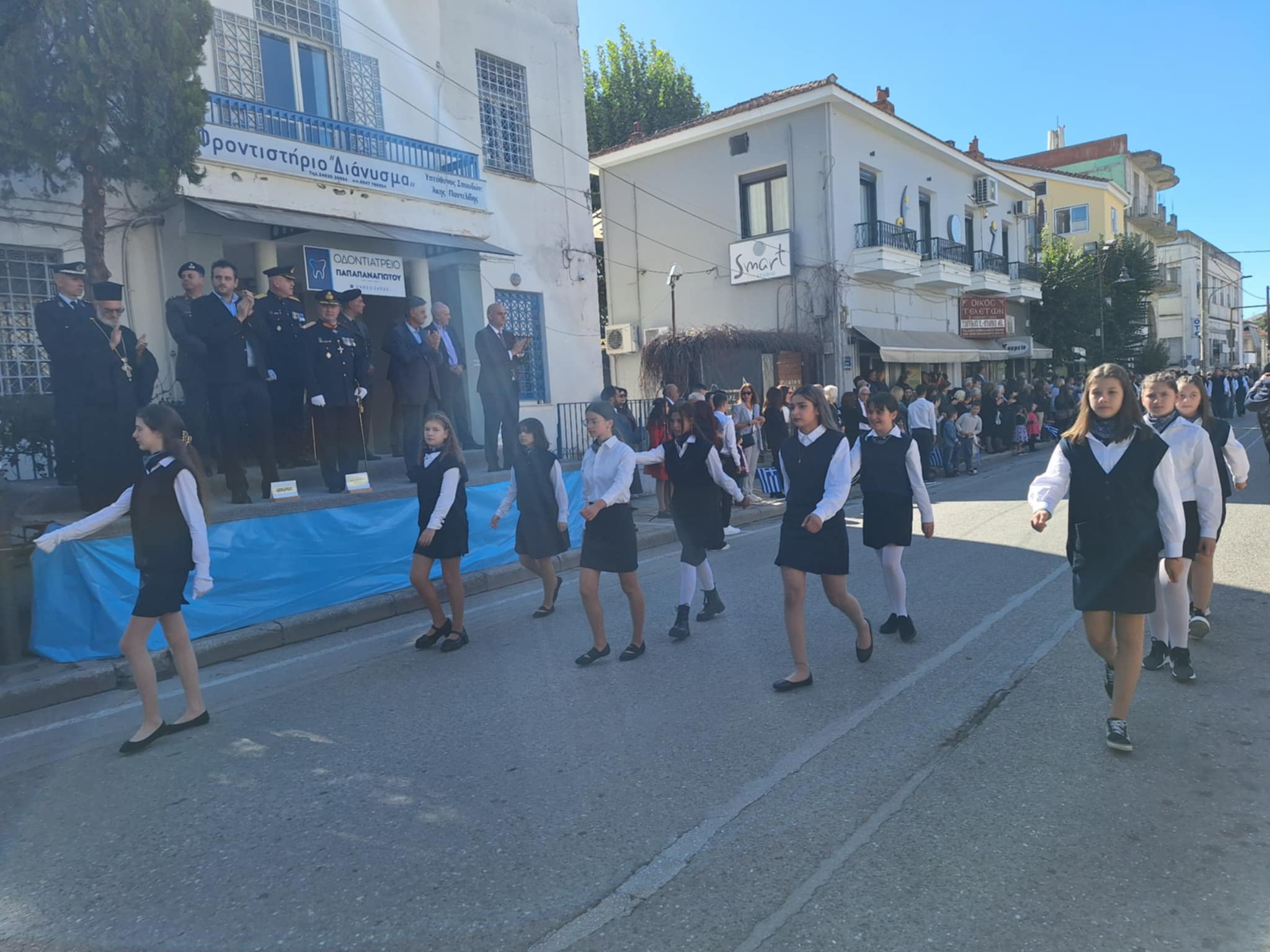 Το μέγα πλήθος του κόσμου παρακολούθησε τη μαθητική παρέλαση που έγινε με τους ήχους της φιλαρμονικής του δήμου και καταχειροκρότησε τους μαθητές.