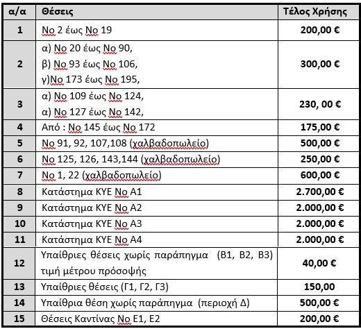 Τα αναλογούντα τέλη χρήσης ανά θέση δραστηριοποίησης είναι τα παρακάτω: