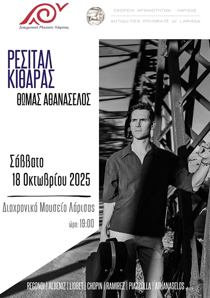 Ρεσιτάλ κιθάρας θα πραγματοποιηθεί από τον σολίστ και καθηγητή κιθάρας Θωμά Αθανασέλο στο Διαχρονικό Μουσείο Λάρισας, το Σάββατο 18 Οκτωβρίου και ώρα 19.00. Θα ακουστούν έργα των Piazzolla, Albeniz, Chopin και άλλων συνθετών, σε ένα ταξίδι από τον ρομαντισμό στο Ισπανικό ταπεραμέντο και στα γεμάτα λυρισμό tangos της Αργεντινής.