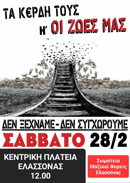 Καλούμε όλο τον λαό της πόλης, ιδιαίτερα τους μαθητές το Σάββατο 28 Φεβρουαρίου στις 12:00 μ. στην Κεντρική Πλατεία Ελασσόνας, να βροντοφωνάξουμε πως οι ζωές μας μετράνε, δεν είναι κόστος, ότι δεν θα συγκαλυφθεί το έγκλημα, ούτε αυτό, ούτε κανένα. Δεν ανεχόμαστε την πολιτική που «φτιάχνει Τέμπη και Βιολάντες», δεν αποδεχόμαστε αυτόν τον ακήρυχτο πόλεμο στην καθημερινότητά μας.