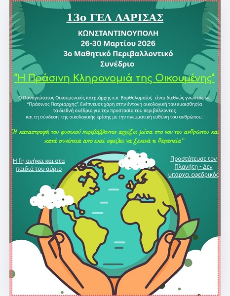 «Η Πράσινη Κληρονομιά της Οικουμένης» , αυτή η παρακαταθήκη που αφήνει ο Παναγιώτατος Οικουμενικός Πατριάρχης κ.κ. Βαρθολομαίος, ήταν η έμπνευση για να ταξιδέψει το 13ο ΓΕΛ Λάρισας στην Κωνσταντινούπολη όπου πήρε μέρος στο 3ο Μαθητικό Περιβαλλοντικό Συνέδριο.