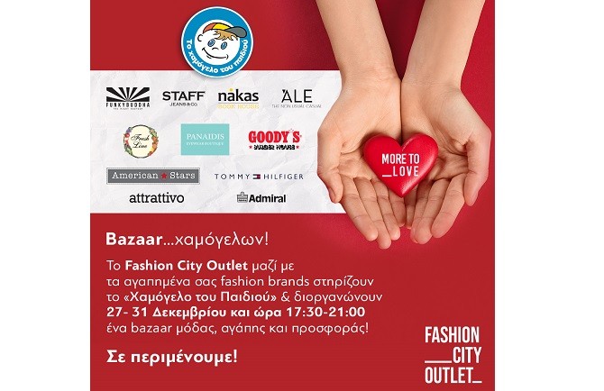 Από σήμερα Δευτέρα 27 έως και την Πέμπτη 30 Ιανουαρίου, καθημερινά από τις 5.30 το απόγευμα έως τις 9 το βράδυ το Fashion City Outlet και «Το Χαμόγελο του Παιδιού» μας καλούν να μπούμε ακόμη περισσότερο σε εορταστική διάθεση και με αίσθημα προσφοράς στον συνάνθρωπο να ενισχύσουμε το έργο του οργανισμού.