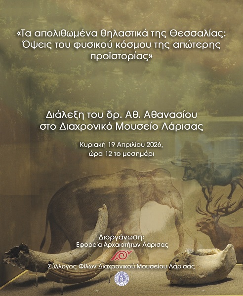 Η Εφορεία Αρχαιοτήτων Λάρισας διοργανώνει την Κυριακή 19 Απριλίου και ώρα 12 το μεσημέρι στο αμφιθέατρο του Διαχρονικού Μουσείου Λάρισας διάλεξη με θέμα «Τα απολιθωμένα θηλαστικά της Θεσσαλίας: Όψεις του φυσικού κόσμου της απώτερης προϊστορίας». Θα μιλήσει ο Αθ. Αθανασίου, δρ γεωλόγος-παλαιοντολόγος της Εφορείας Παλαιοανθρωπολογίας–Σπηλαιολογίας του Υπουργείου Πολιτισμού.