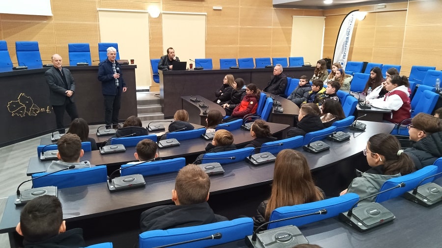 Αρχικά έγινε ενημέρωση των μαθητών για θέματα Πολιτικής Προστασίας στην Αίθουσα Συνεδριάσεων του Περιφερειακού Συμβουλίου, από τον προϊστάμενο του Τμήματος Σχεδιασμού Μέτρων Πρόληψης και Σχεδίων Αντιμετώπισης Καταστροφών, κ. Ιωάννη Χλόπτσιο. Οι μαθητές συμμετείχαν ενεργητικά σε μία ενδιαφέρουσα διαδραστική παρουσίαση, ενώ απεύθυναν ερωτήσεις και απορίες.