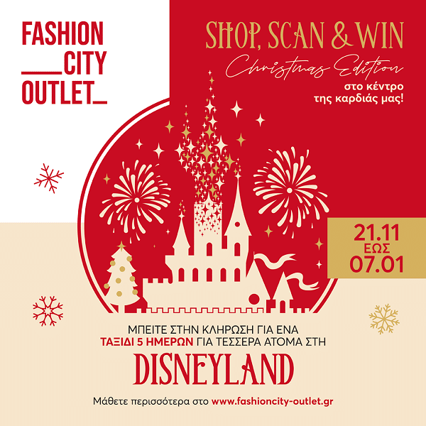 Από τις 21 Νοεμβρίου έως τις 7 Ιανουαρίου, το εμπορικό κέντρο «της καρδιάς μας» προσκαλεί όλους τους επισκέπτες να συμμετέχουν στη μεγάλη χριστουγεννιάτικη προωθητική ενέργεια SHOP, SCAN & WIN – CHRISTMAS EDITION, με δώρο ένα πενθήμερο ταξίδι τεσσάρων ατόμων στη Disneyland Paris!