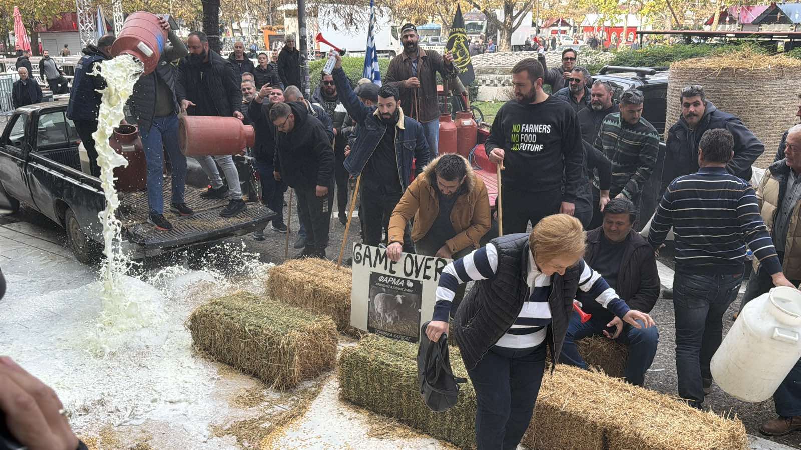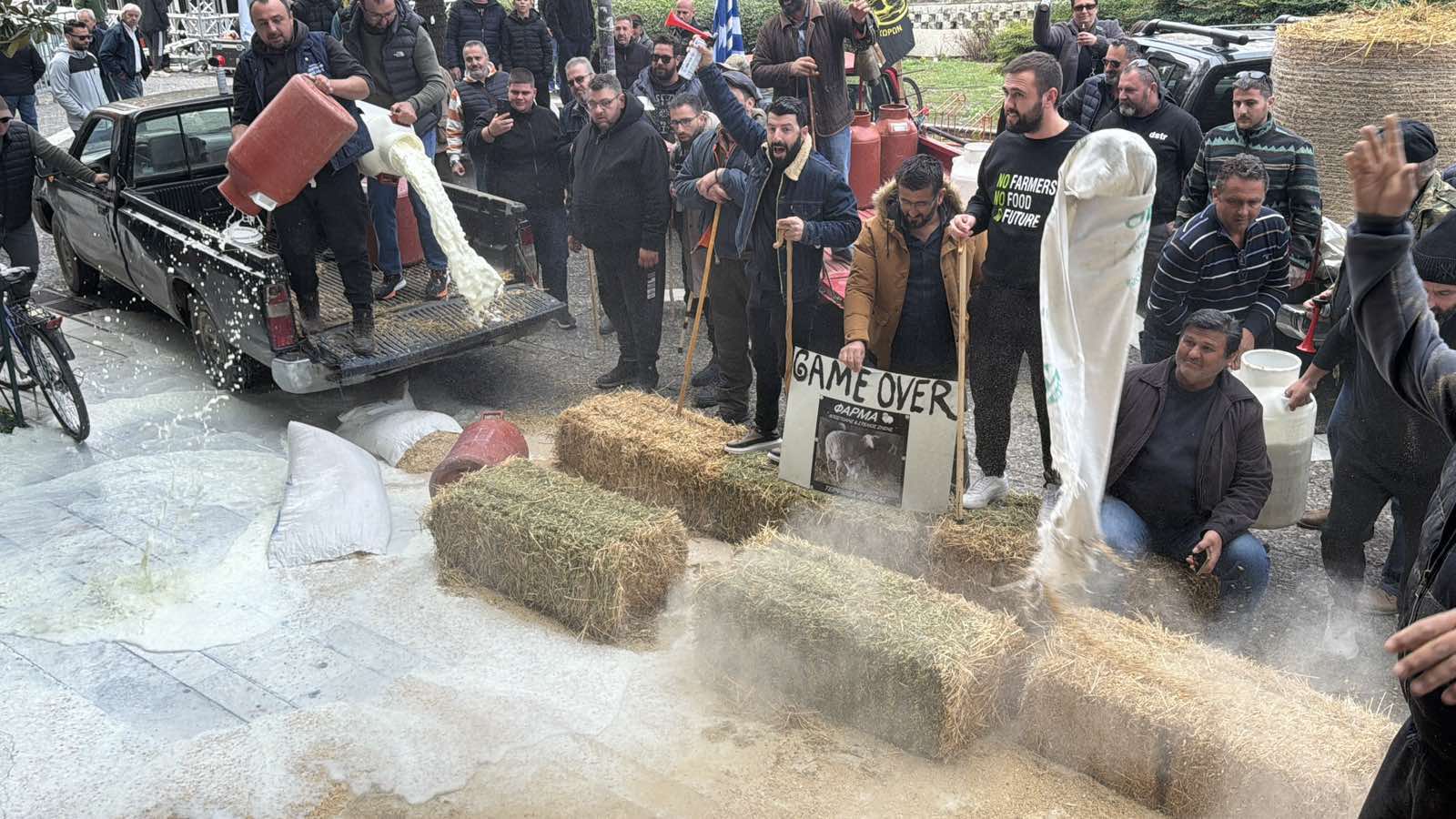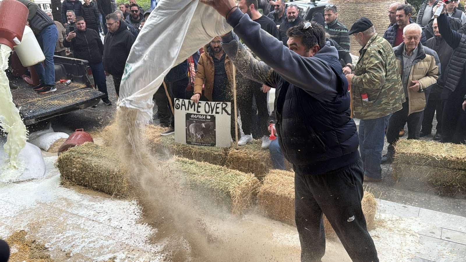 Ξεχειλίζει η οργή των κτηνοτρόφων – Έριξαν γάλα και ζωοτροφές στην πλατεία της Λάρισας