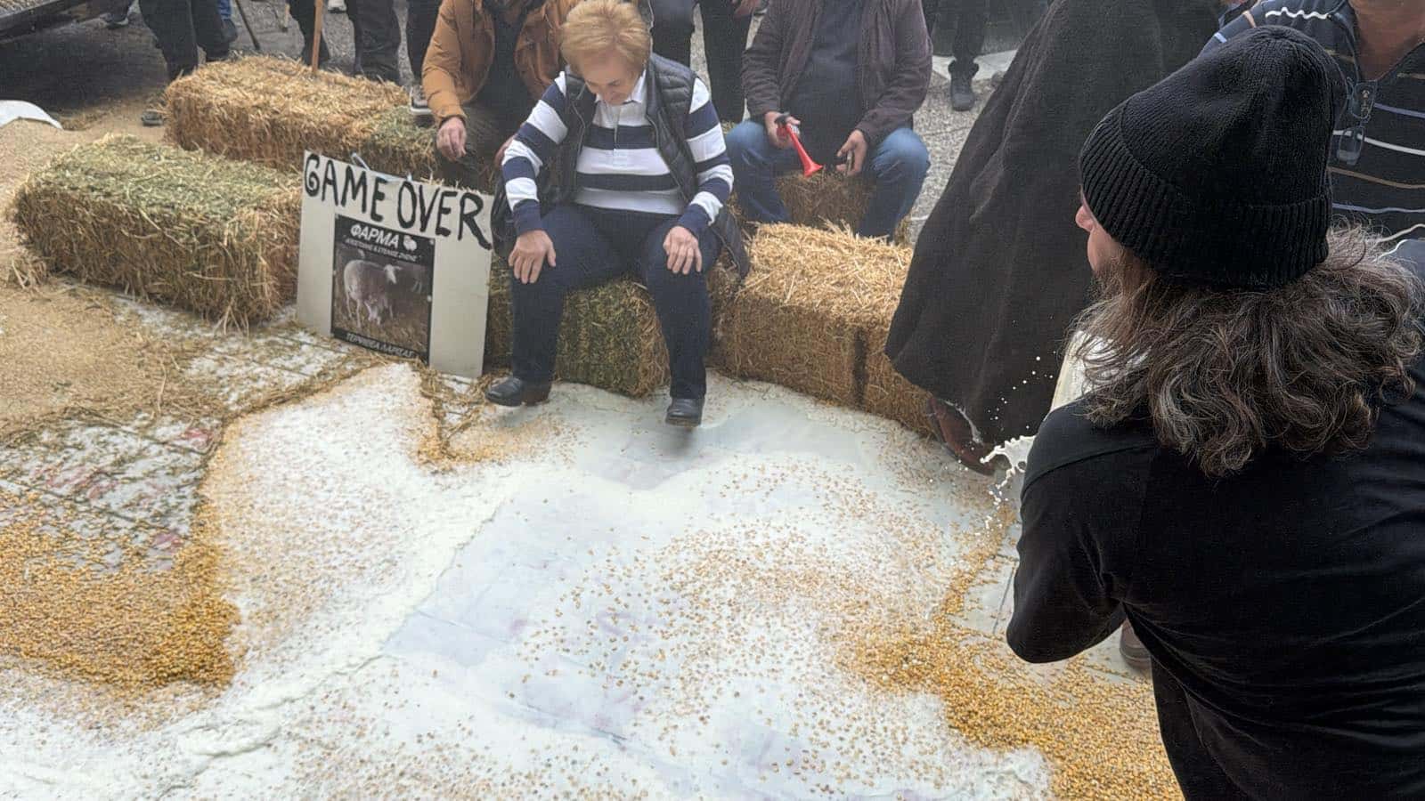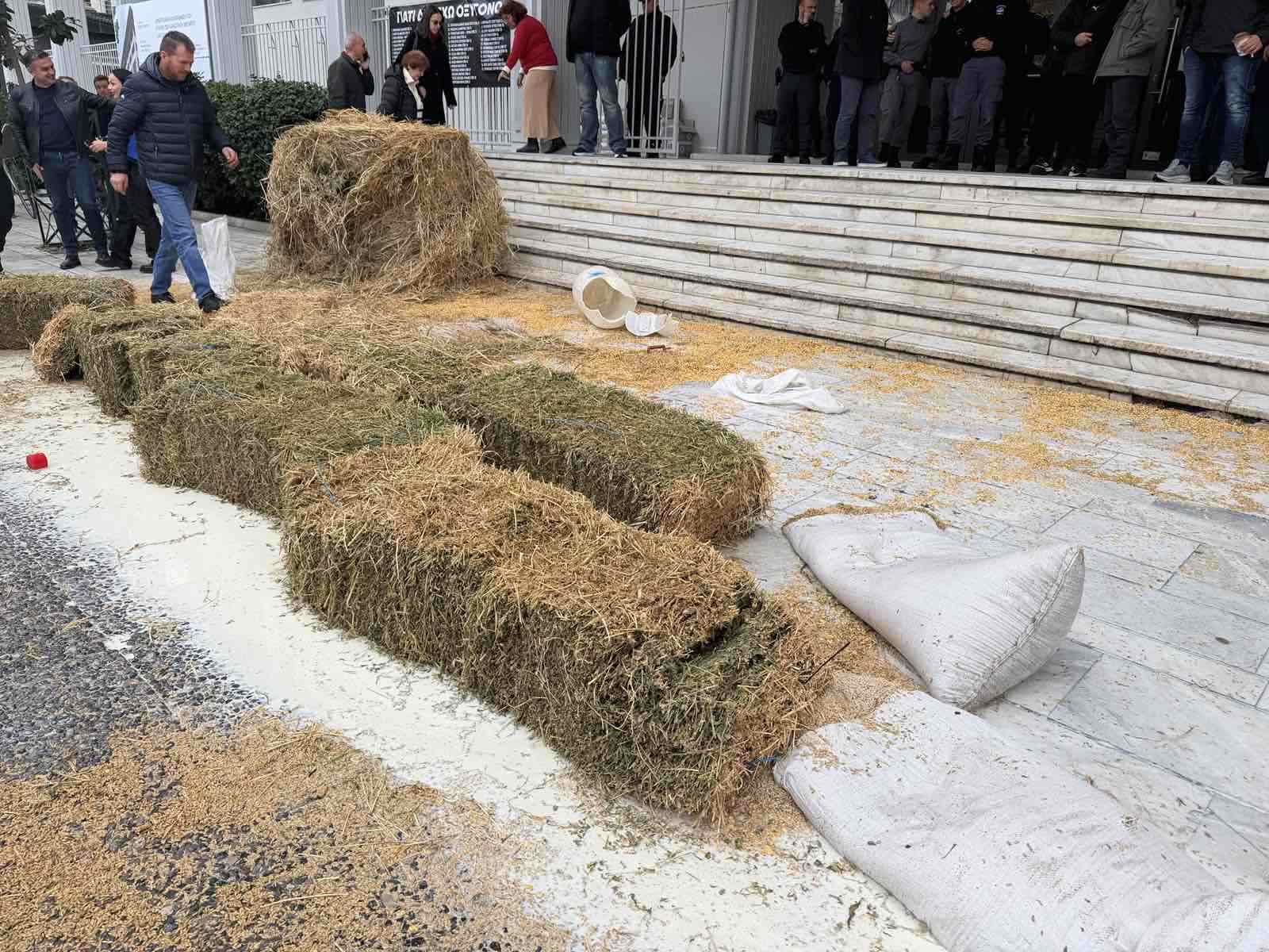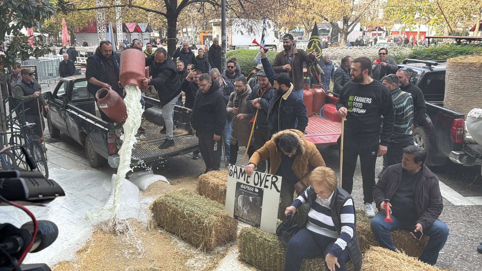 Ξεχειλίζει η οργή των κτηνοτρόφων – Έριξαν γάλα και ζωοτροφές στην πλατεία της Λάρισας